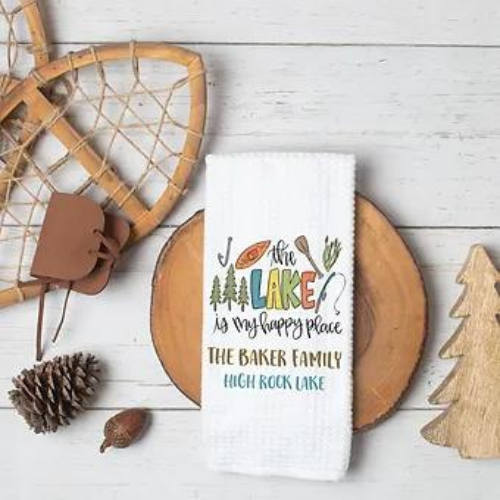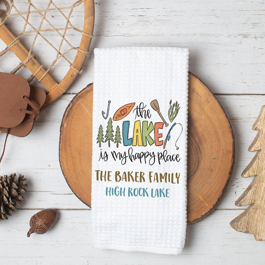 Personalized The Lake Is My Happy Place Kitchen Towel | Lake House Decor | Lake House Gift | Lake Themed Kitchen | Custom Lake Accessories
