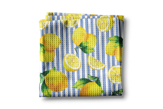 Lemon Stripe Blue White Kitchen Towel Waffle Weave Floral Citrus Spring Preppy Hostess