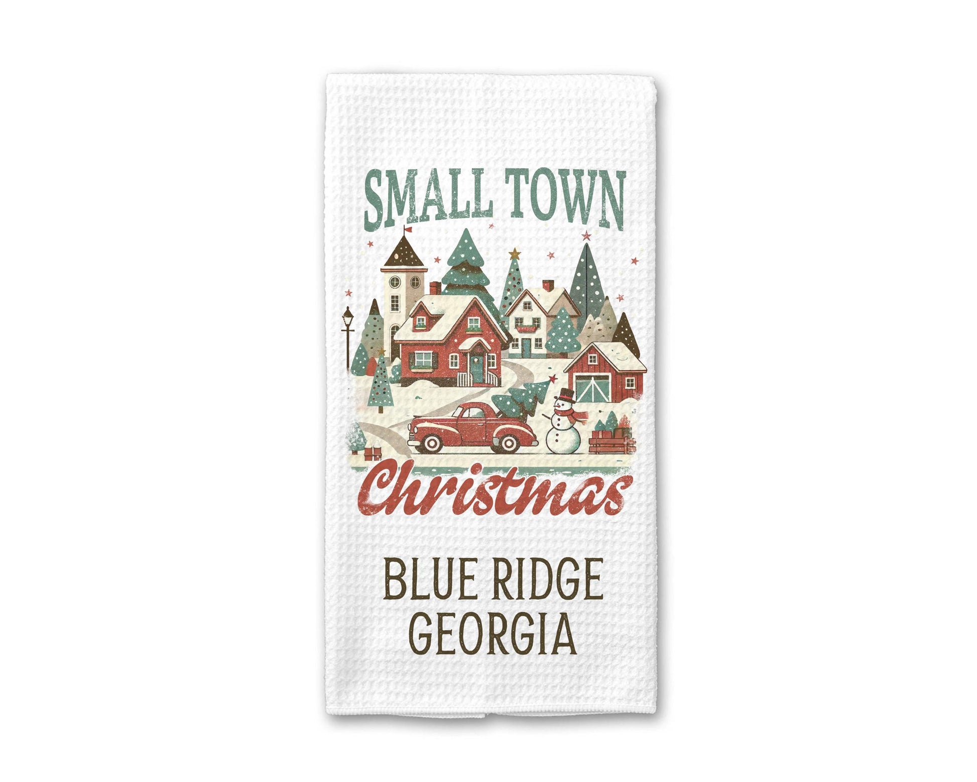 This waffle weave towel is the perfect addition to your Christmas and festive decor, and makes a great souvenir from a charming downtown, tourist destination, or family farm. Customize with your own location!