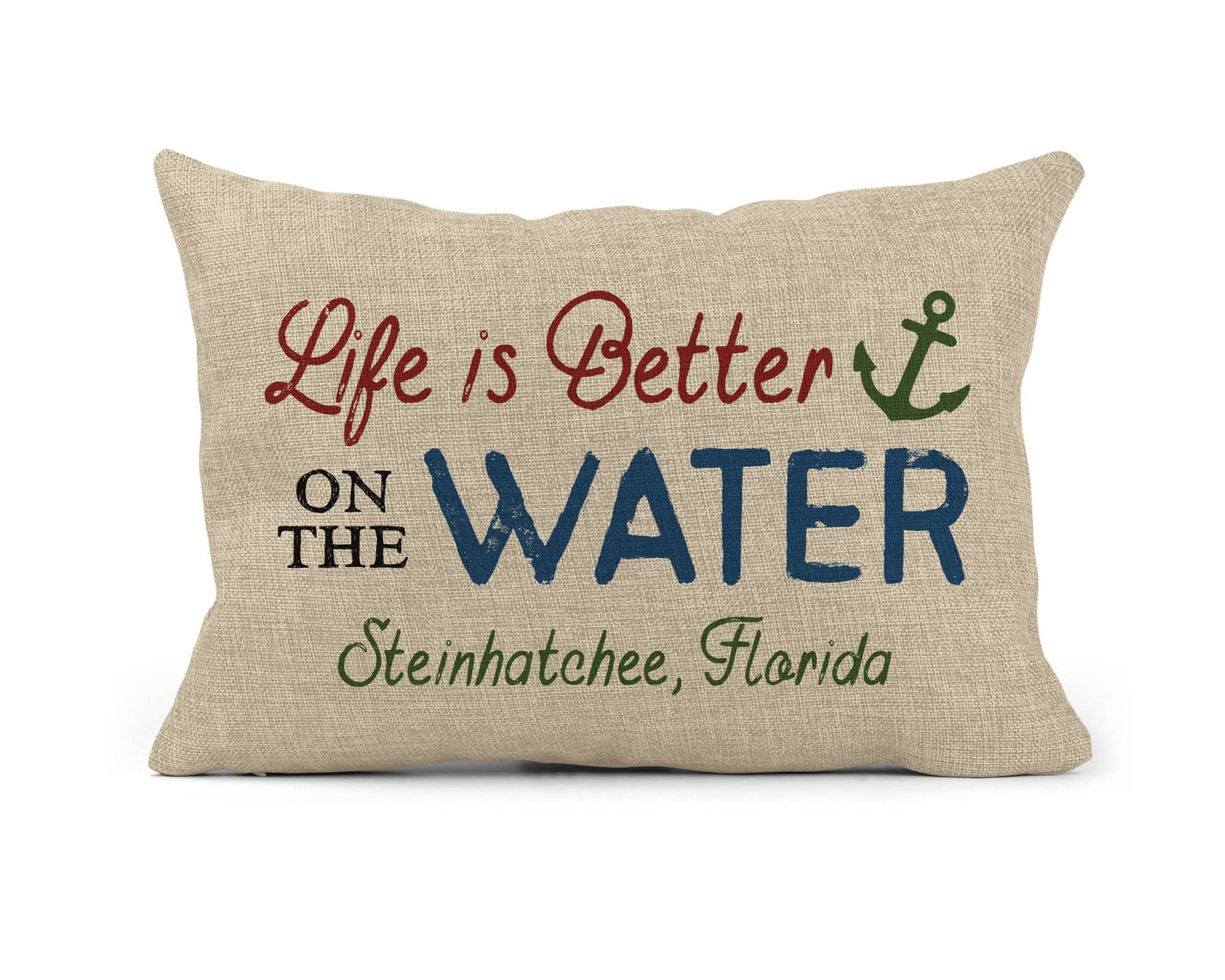 This Life is Better on the Water Rectangle pillow is a perfect addition to a lakeside cabin or vacation home! Pillows never go out of style and make excellent housewarming, wedding, hostess, and just because gifts. This rectangle half pillow is the perfect addition to your mountain or nature themed home, and makes a great souvenir from a national park, mountain range, or campsite retreat. Customize with your own location!
