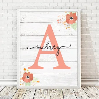 Personalized Coral Monogram on Wood Background Print