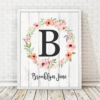 Personalized Floral Wreath Monogram Print with Wooden Background