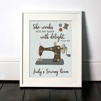 Personalized She Works With Her Hands With Delight Sewing Room Print